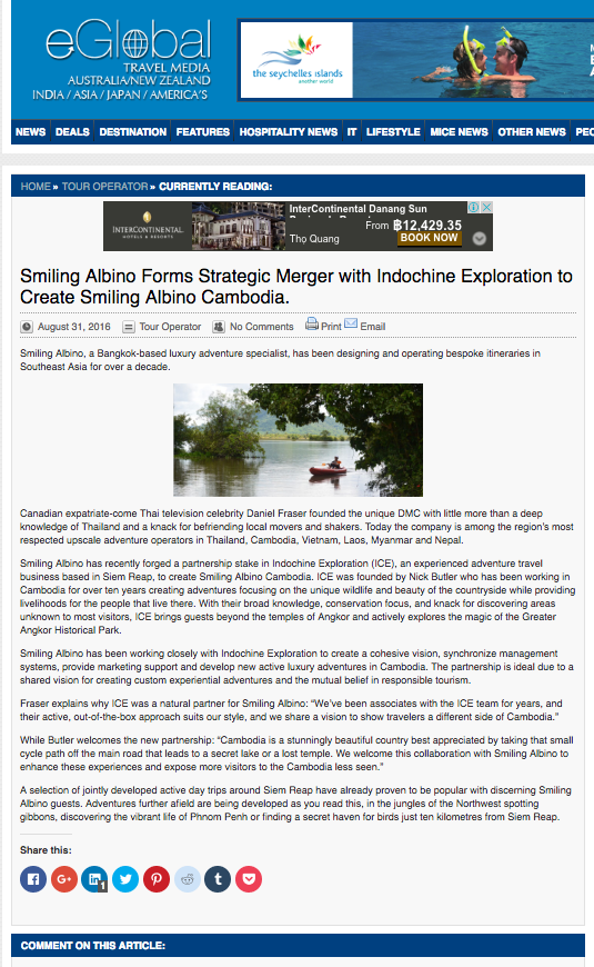 - Global Travel Media, August 31, 2016, Smiling Albino Forms Strategic Merger with Indochine Exploration to Create Smiling Albino Cambodia